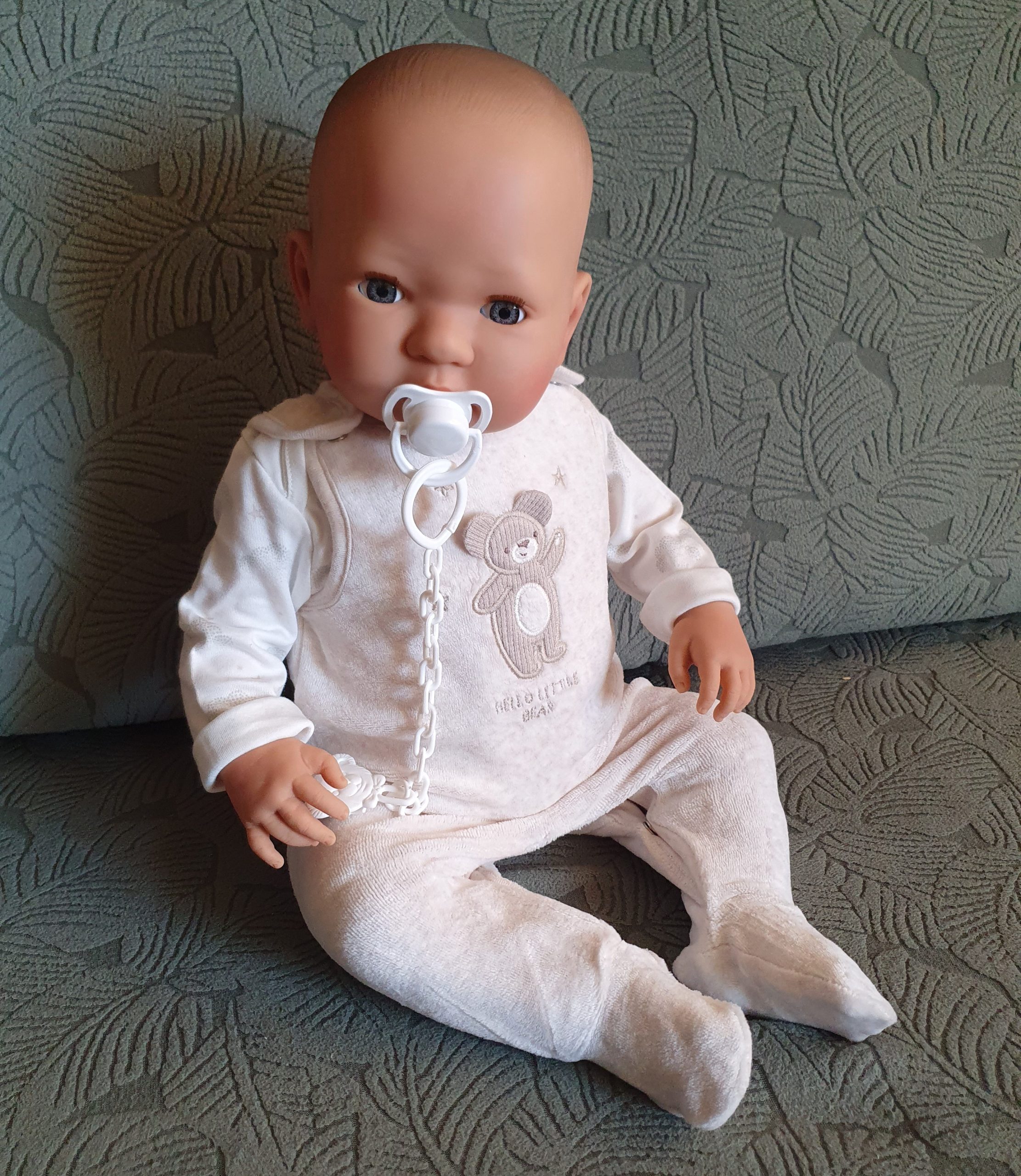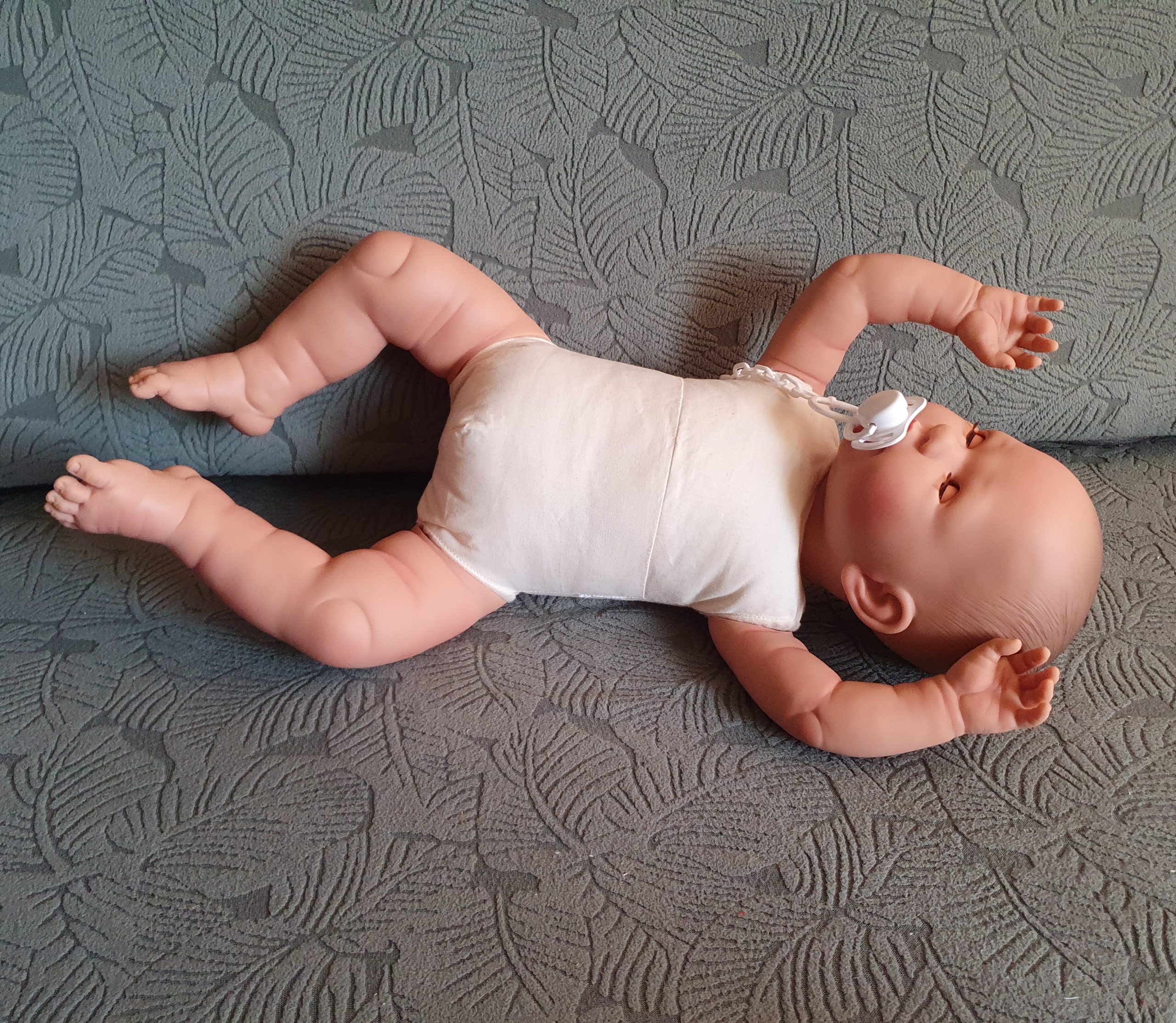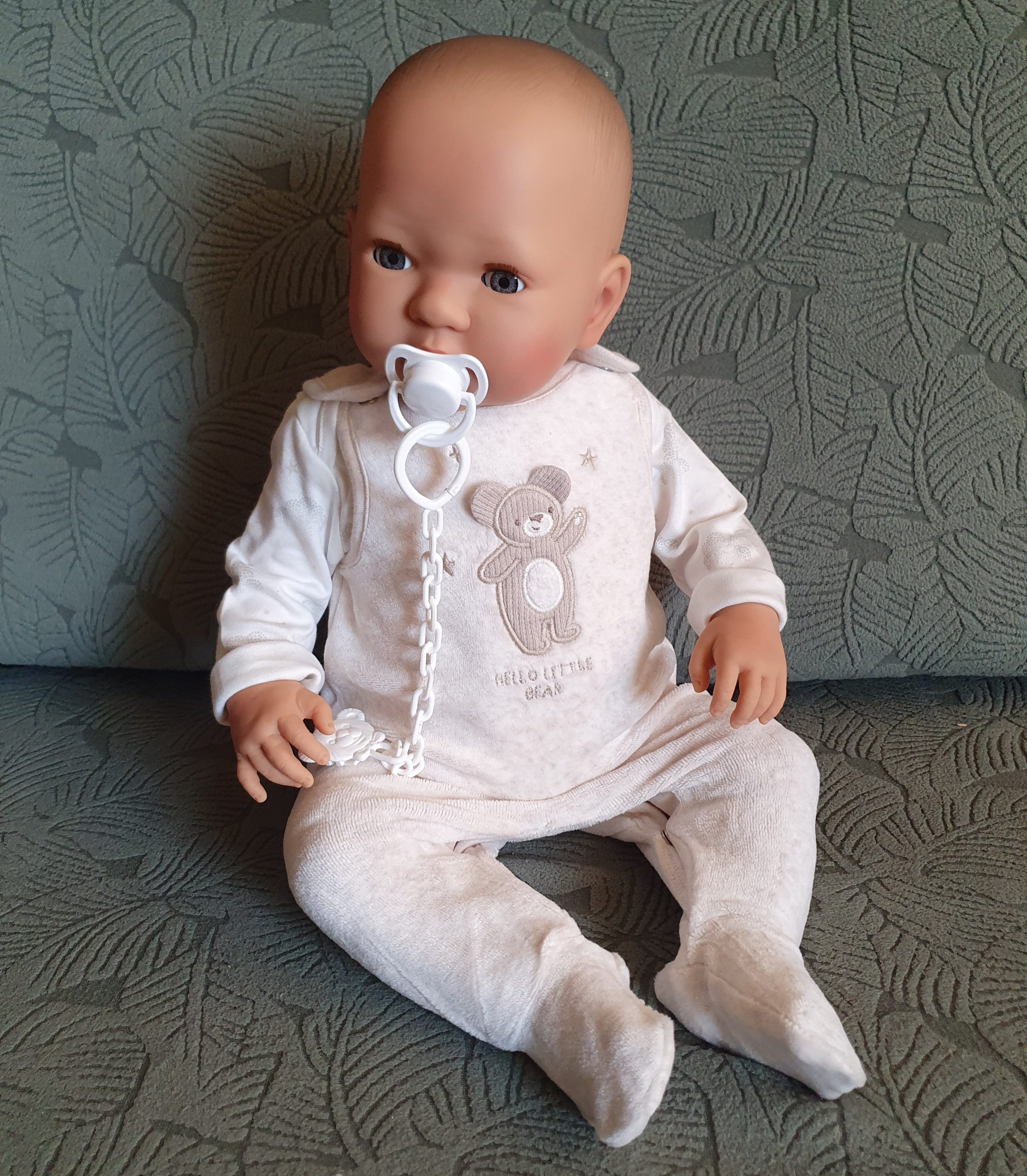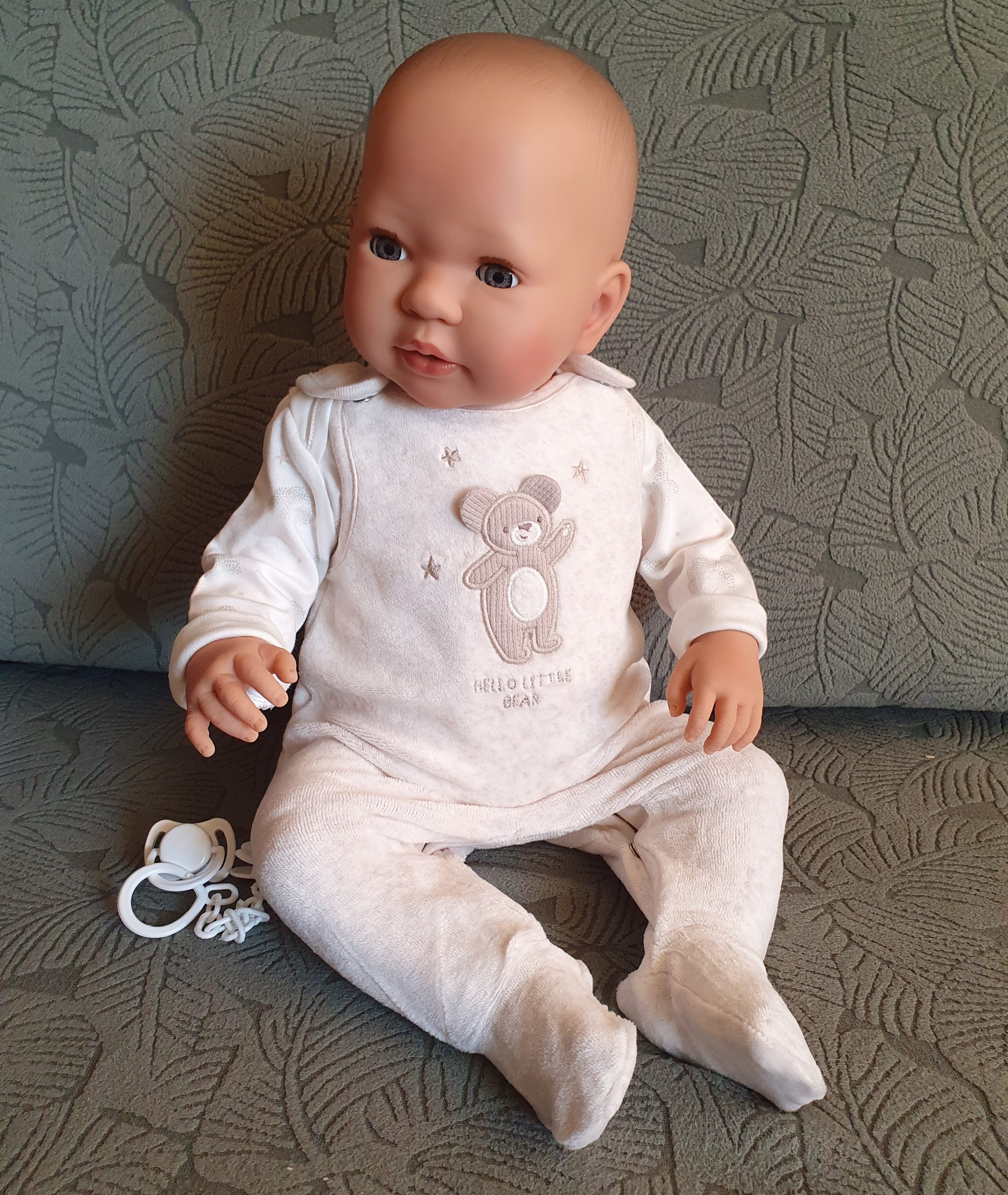 Liam is grote maat Levensechte Babypop met blauwe slaapogen maat 52 cm. Het lijf is van stof, de armen benen en hoofdje zijn gemaakt van vinyl. De armen en benen zijn draaibaar. Baby Liam kan dus ook goed zelfstandig zitten. Babypop Liam heeft een getailleerd gezichtje en blauwe ogen die open en dichtgaan. Maat 52 cm. Baby Liam past kleine babykleding. Let op het kleinste maatje 50 babykleding past het best. Inclusief velours pakje en truitje passende speen wit met speenketting. Liam is geschikt als speelpop. En geschikt als demonstratiepop show pop voor babykleding. Deze pop is ook zeer geschikt voor ouderen met dementie en als oefenpop voor scholen. Deze pop is niet geschikt voor kinderen onder de 3 jaar. Verpakking : Deze poppen worden door de fabrikant aan ons geleverd in plastic, wij doen daar zelf een recycle doos omheen voor de verzending naar onze klanten. Gratis verzending binnen Nederland. Klanten uit België betalen een toeslag vanwege de hogere verzendkosten naar België.