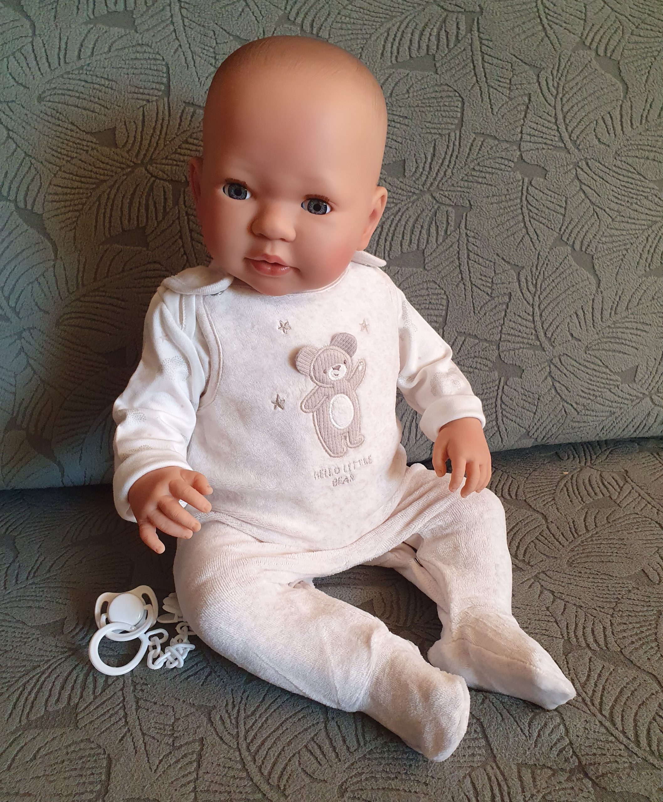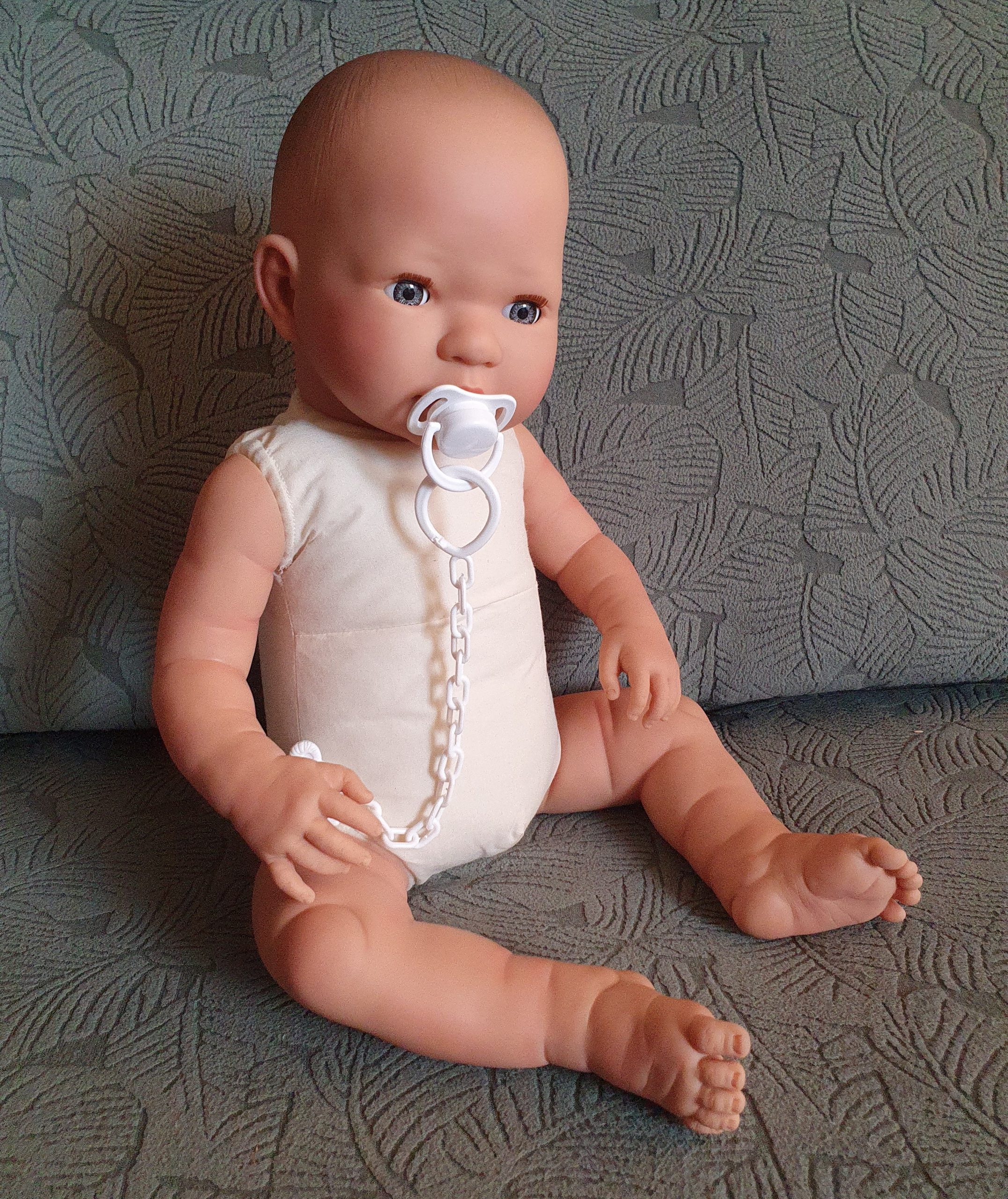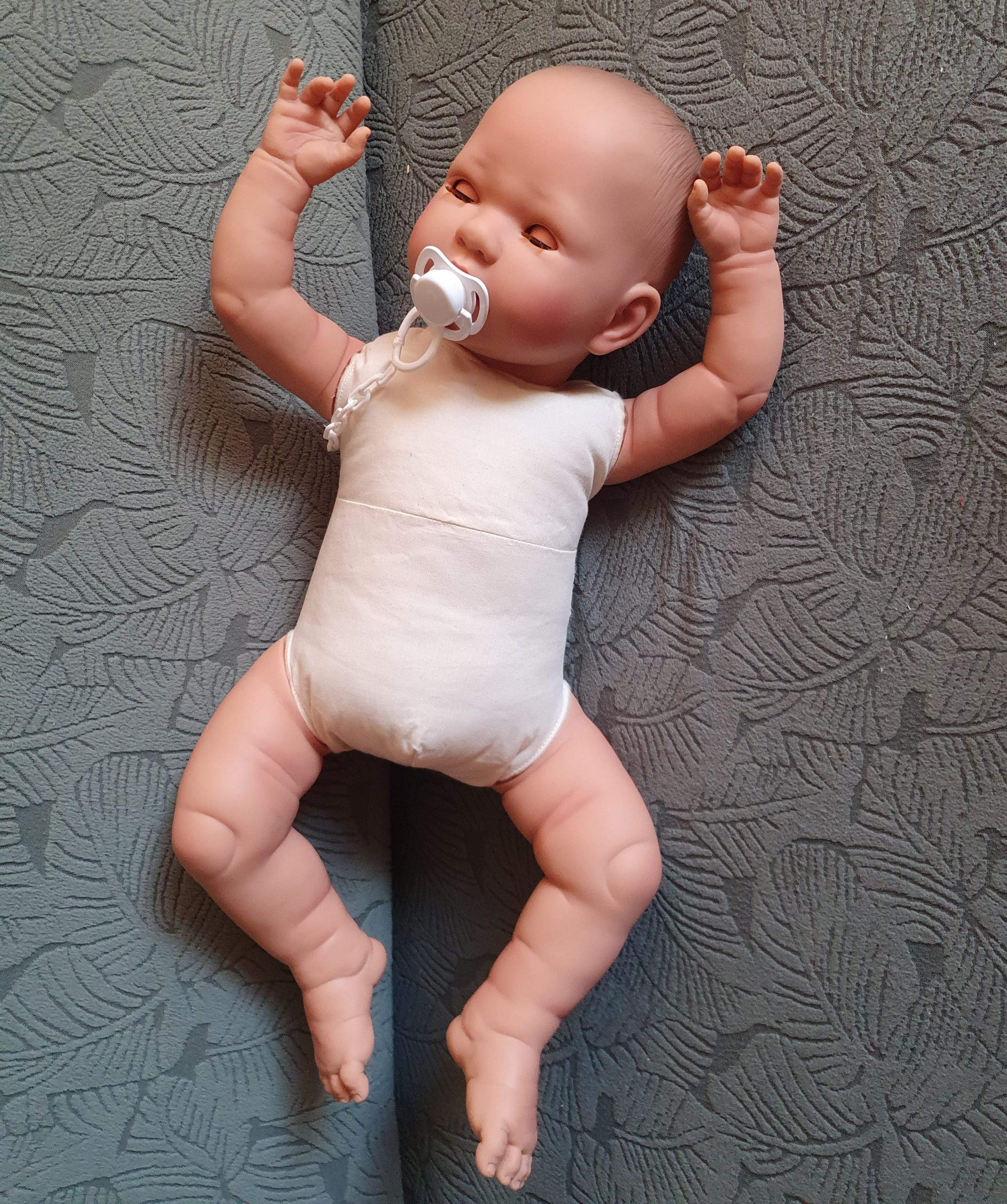 Liam is grote maat Levensechte Babypop met blauwe slaapogen maat 52 cm. Het lijf is van stof, de armen benen en hoofdje zijn gemaakt van vinyl. De armen en benen zijn draaibaar. Baby Liam kan dus ook goed zelfstandig zitten. Babypop Liam heeft een getailleerd gezichtje en blauwe ogen die open en dichtgaan. Maat 52 cm. Baby Liam past kleine babykleding. Let op het kleinste maatje 50 babykleding past het best. Inclusief velours pakje en truitje passende speen wit met speenketting. Liam is geschikt als speelpop. En geschikt als demonstratiepop show pop voor babykleding. Deze pop is ook zeer geschikt voor ouderen met dementie en als oefenpop voor scholen. Deze pop is niet geschikt voor kinderen onder de 3 jaar. Verpakking : Deze poppen worden door de fabrikant aan ons geleverd in plastic, wij doen daar zelf een recycle doos omheen voor de verzending naar onze klanten. Gratis verzending binnen Nederland. Klanten uit België betalen een toeslag vanwege de hogere verzendkosten naar België.