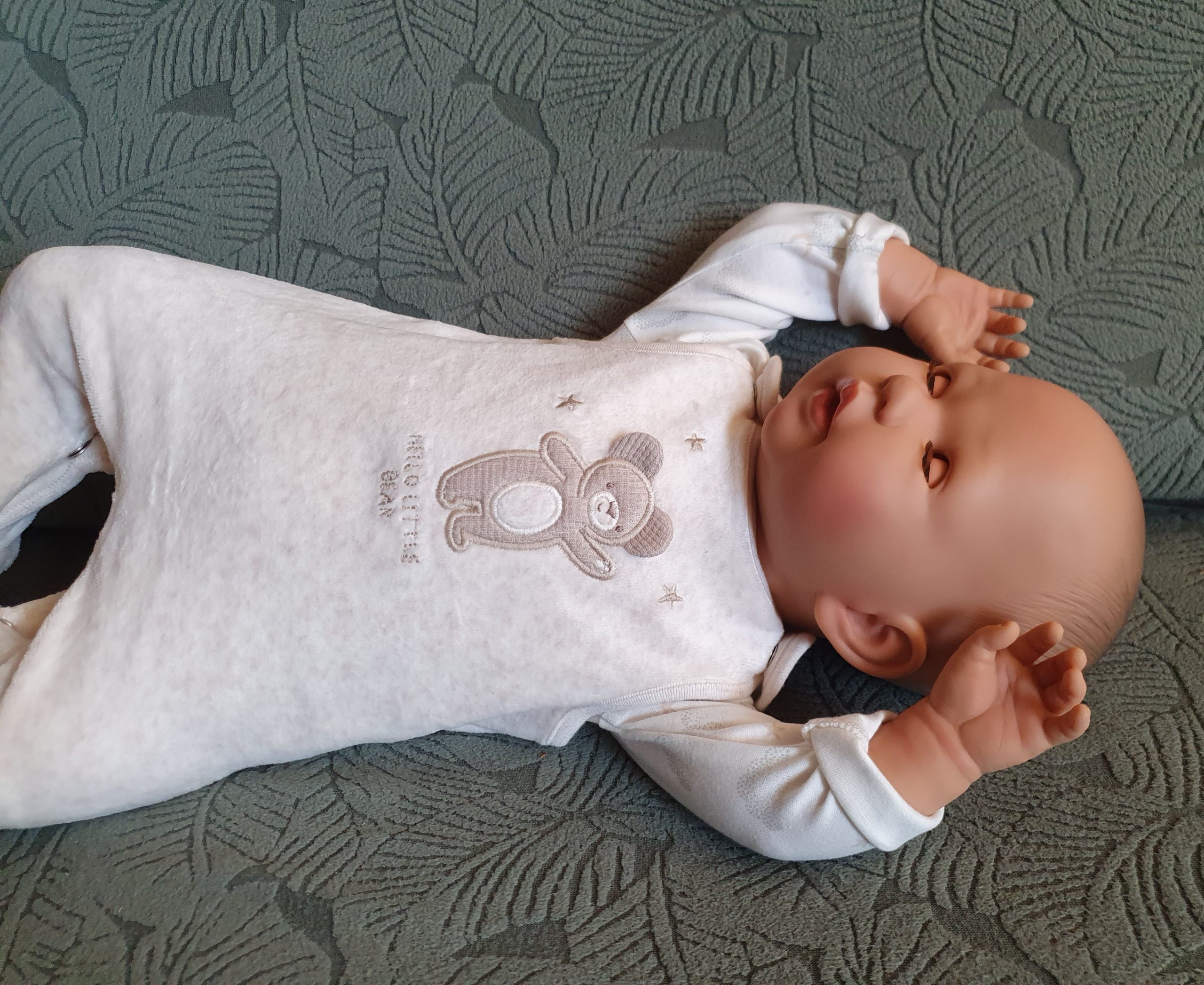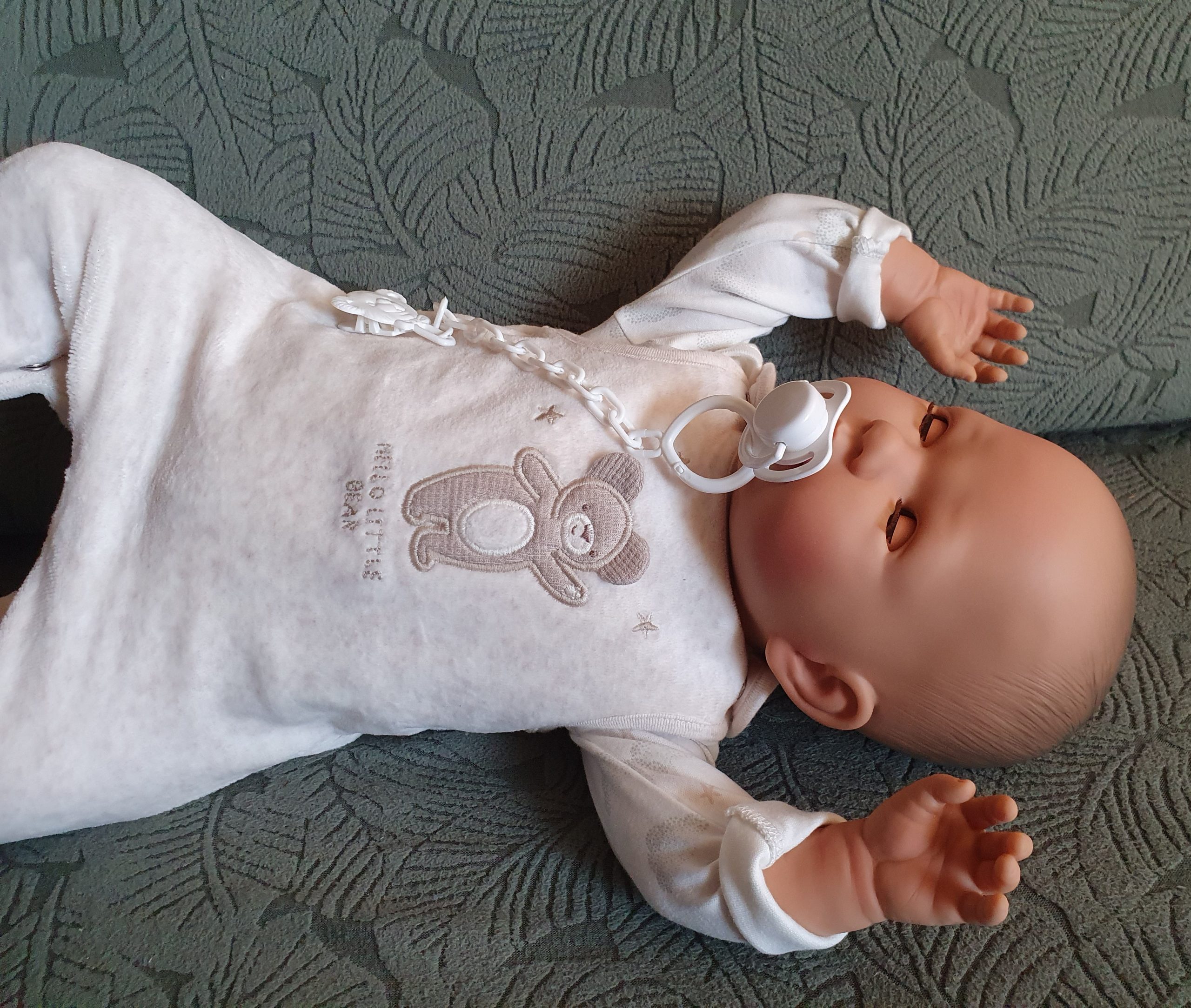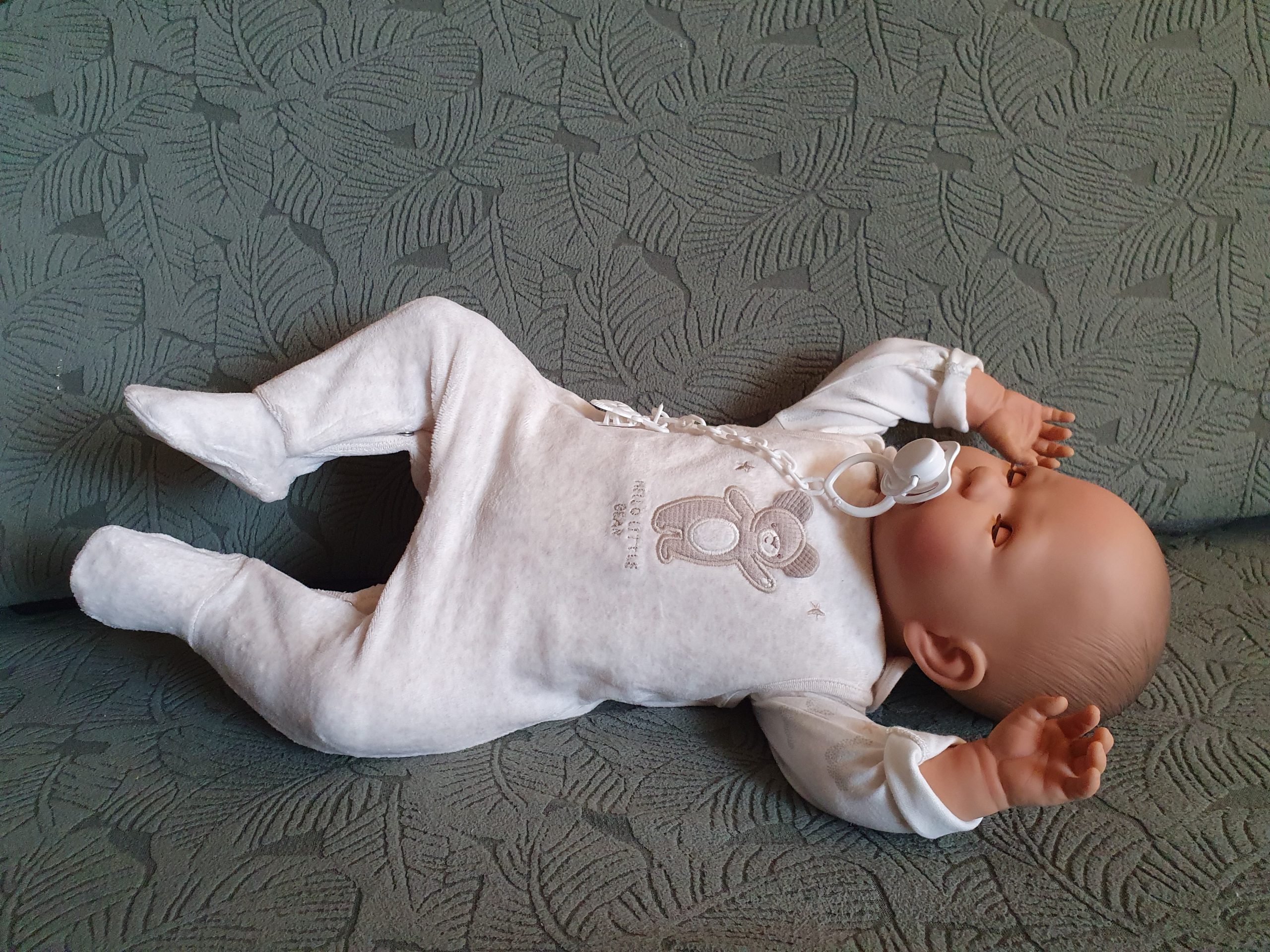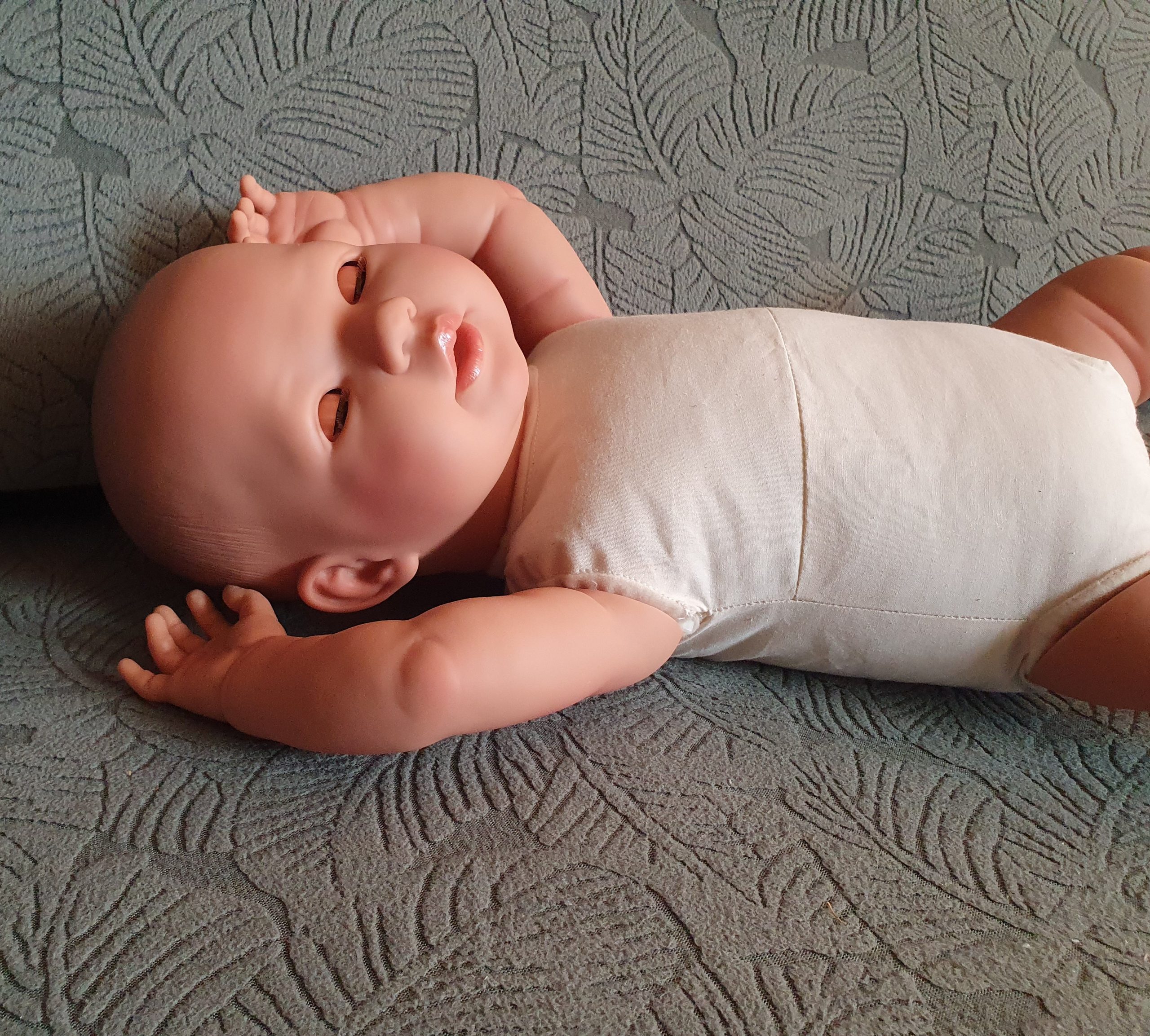 Liam is grote maat Levensechte Babypop met blauwe slaapogen maat 52 cm. Het lijf is van stof, de armen benen en hoofdje zijn gemaakt van vinyl. De armen en benen zijn draaibaar. Baby Liam kan dus ook goed zelfstandig zitten. Babypop Liam heeft een getailleerd gezichtje en blauwe ogen die open en dichtgaan. Maat 52 cm. Baby Liam past kleine babykleding. Let op het kleinste maatje 50 babykleding past het best. Inclusief velours pakje en truitje passende speen wit met speenketting. Liam is geschikt als speelpop. En geschikt als demonstratiepop show pop voor babykleding. Deze pop is ook zeer geschikt voor ouderen met dementie en als oefenpop voor scholen. Deze pop is niet geschikt voor kinderen onder de 3 jaar. Verpakking : Deze poppen worden door de fabrikant aan ons geleverd in plastic, wij doen daar zelf een recycle doos omheen voor de verzending naar onze klanten. Gratis verzending binnen Nederland. Klanten uit België betalen een toeslag vanwege de hogere verzendkosten naar België.