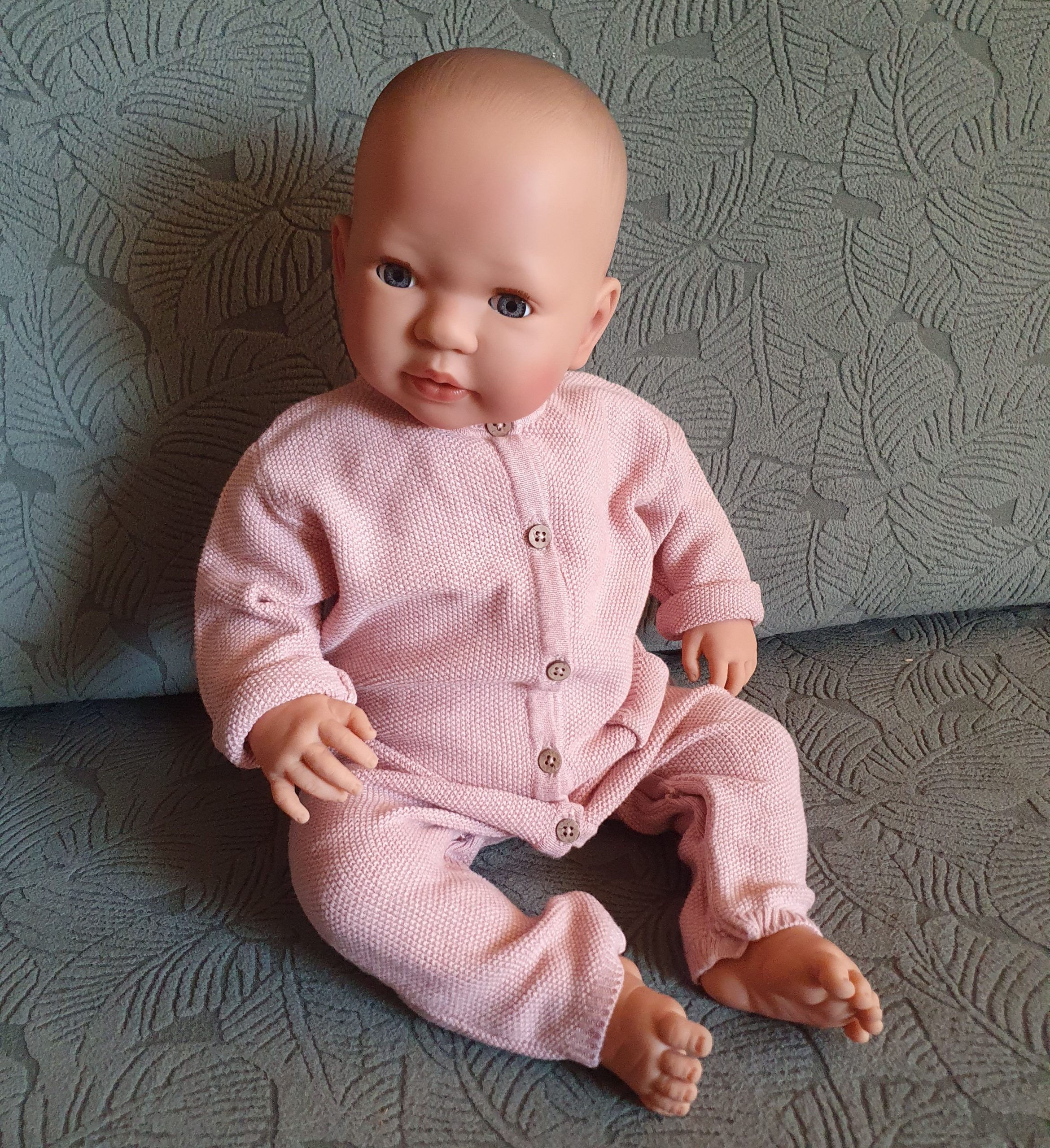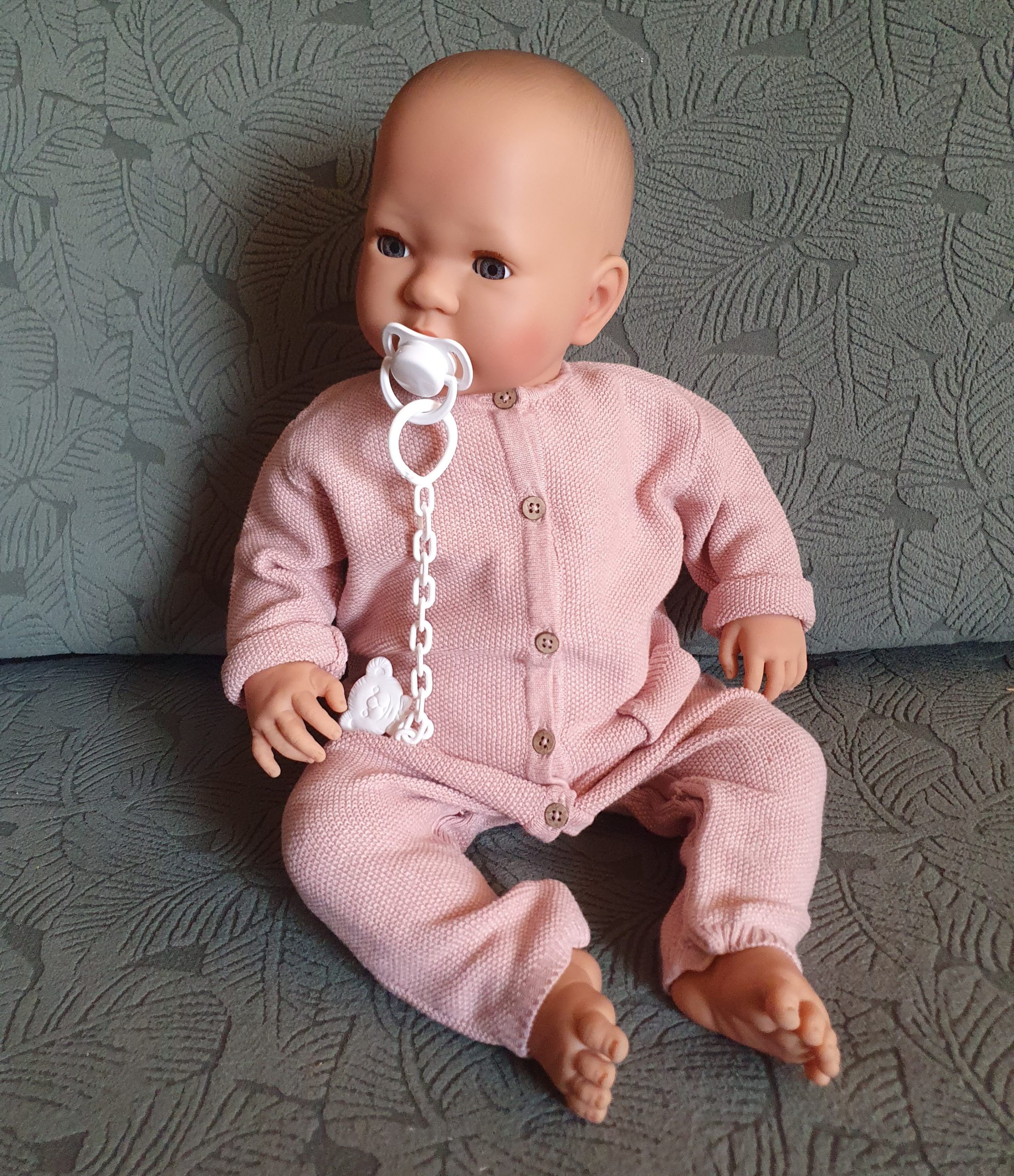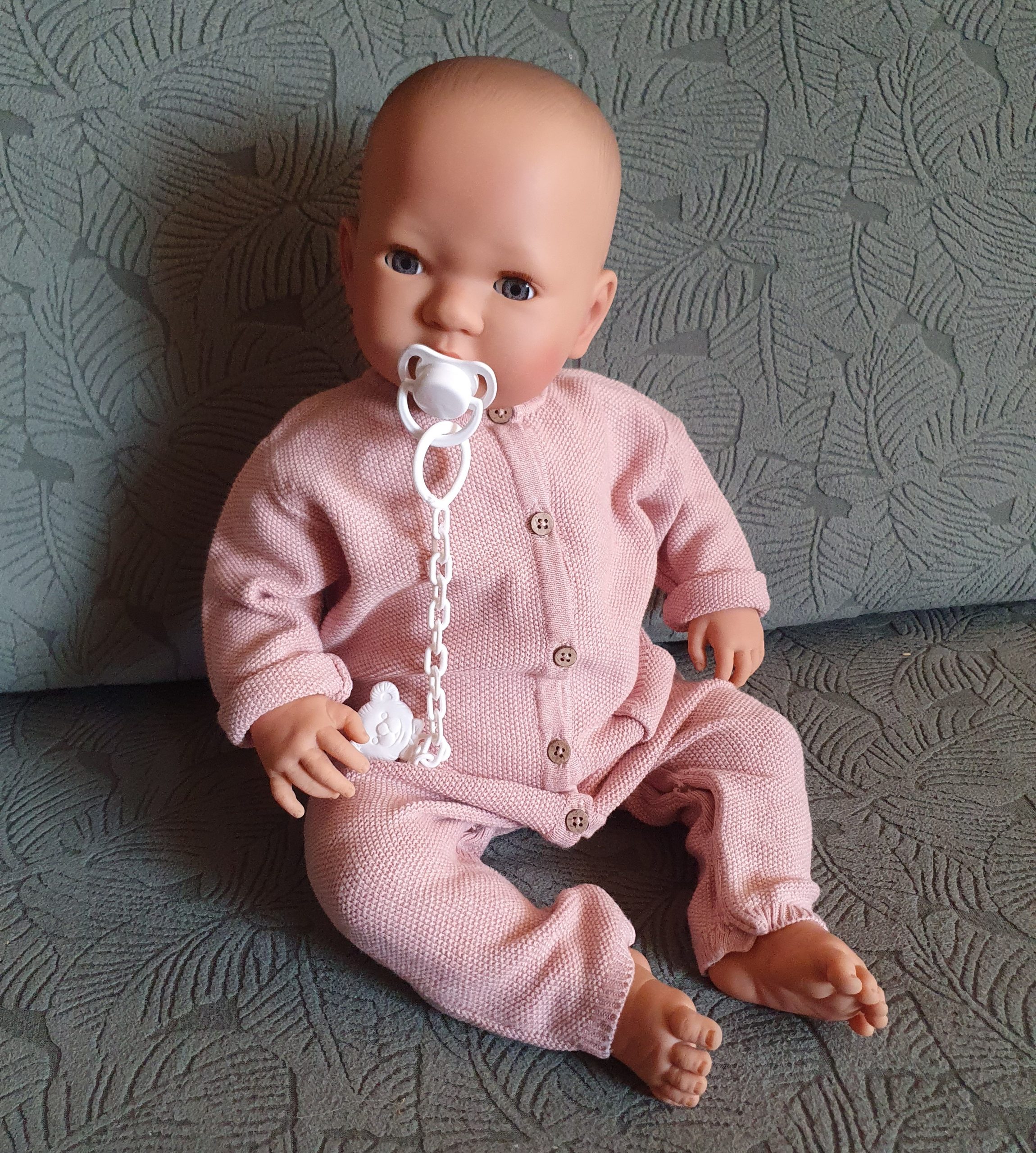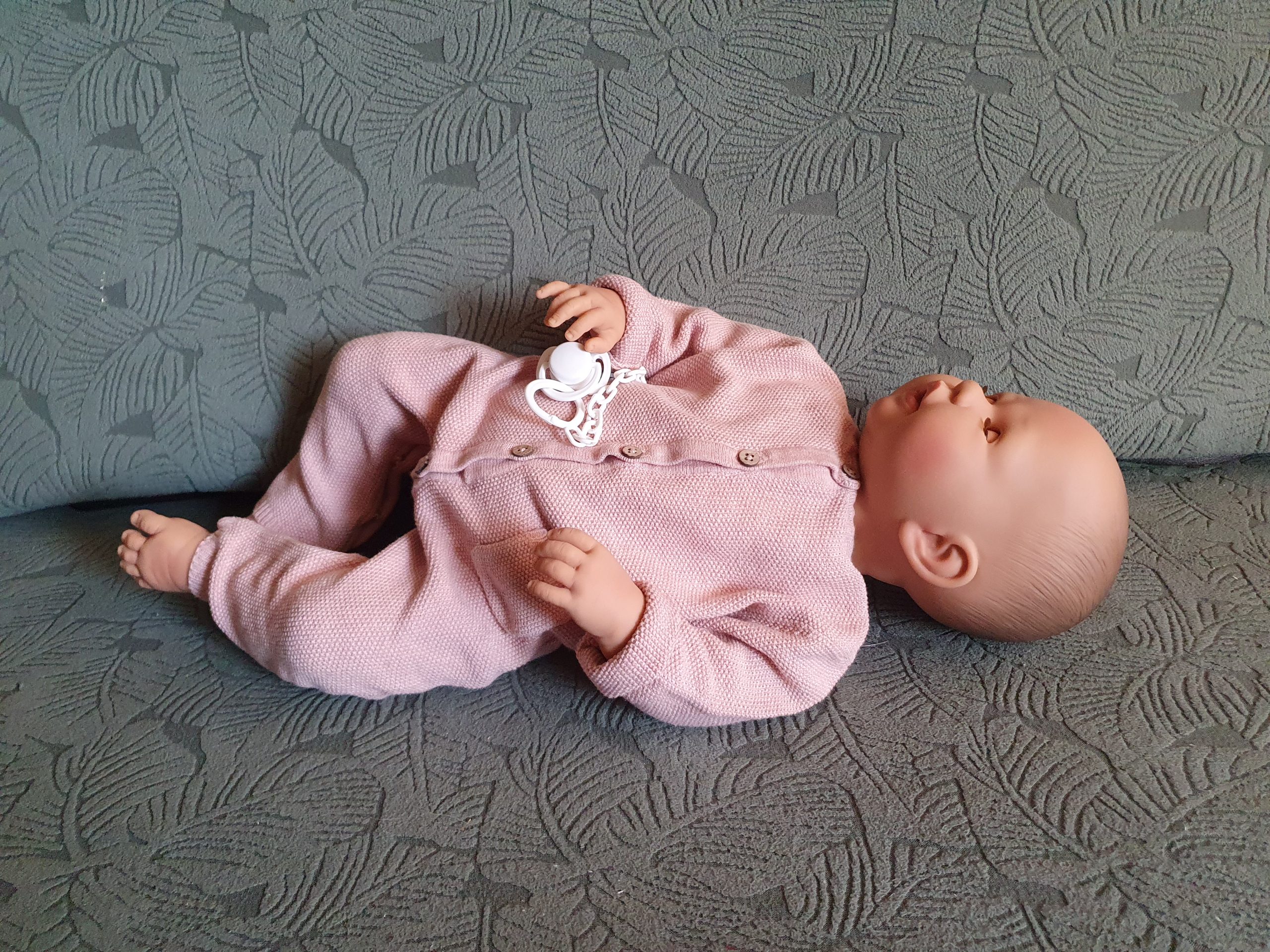 Het lijfje is van stof, de armen benen en hoofdje zijn gemaakt van vinyl. De armen en benen zijn draaibaar, de pop kan dus ook goed zelfstandig zitten. De pop heeft een mooi getailleerd gezichtje en blauwe ogen die open en dichtgaan. Maat 52 cm. Deze pop past kleine babykleding. Let op maatje 50 babykleding past het best. Inclusief mooi pakje en speen met speenketting. Lisa is geschikt als speelpop en als show pop voor babykleding. Deze pop is ook zeer geschikt voor ouderen met dementie en als oefenpop voor school. Deze pop is niet geschikt voor kinderen onder de 3 jaar. Verpakking : Deze poppen worden door de fabrikant aan ons geleverd in plastic, wij doen daar zelf een recycle doos omheen voor de verzending naar onze klanten. Gratis verzending binnen Nederland. Klanten uit België betalen een toeslag vanwege de hogere verzendkosten naar België.