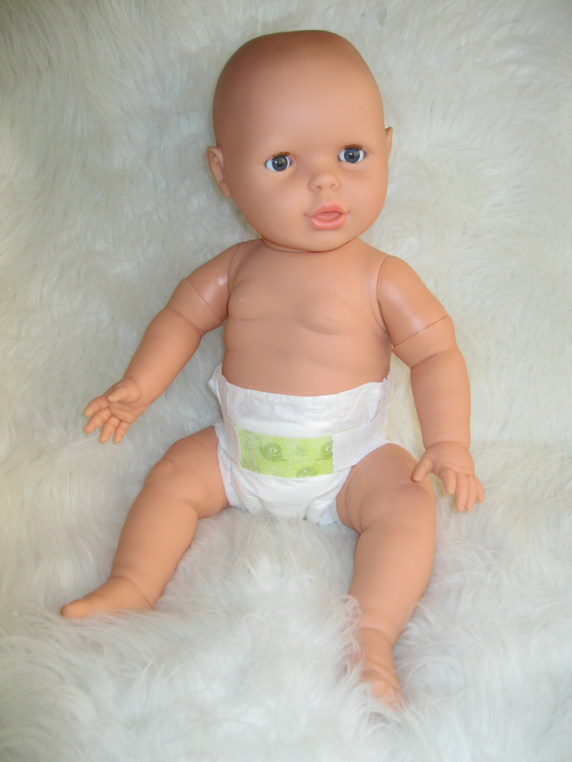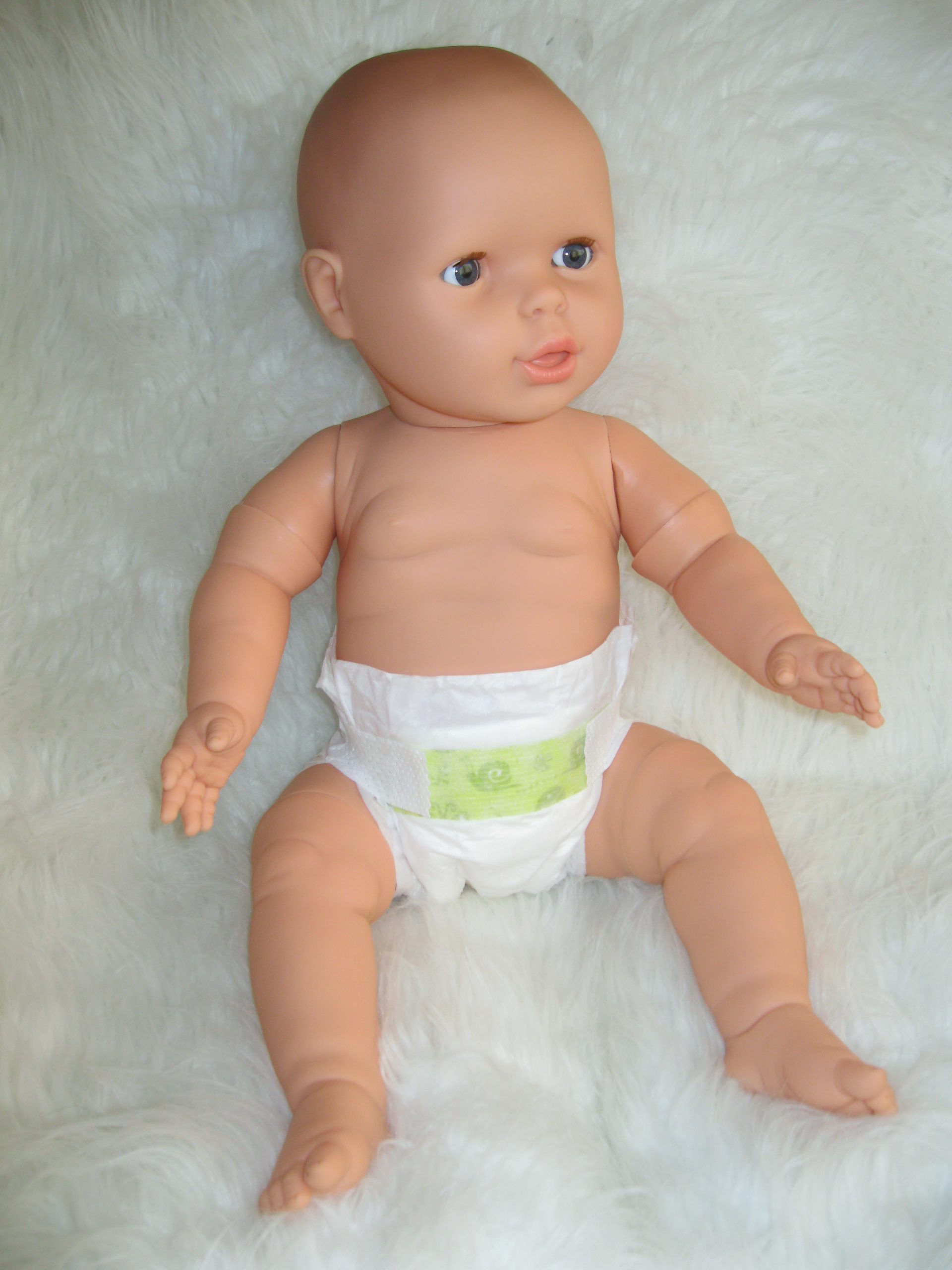 Deze pop is geheel gemaakt van vinyl. De armen en benen hebben draaibare ledematen zodat de pop gemakkelijk aan en uit te kleden is.