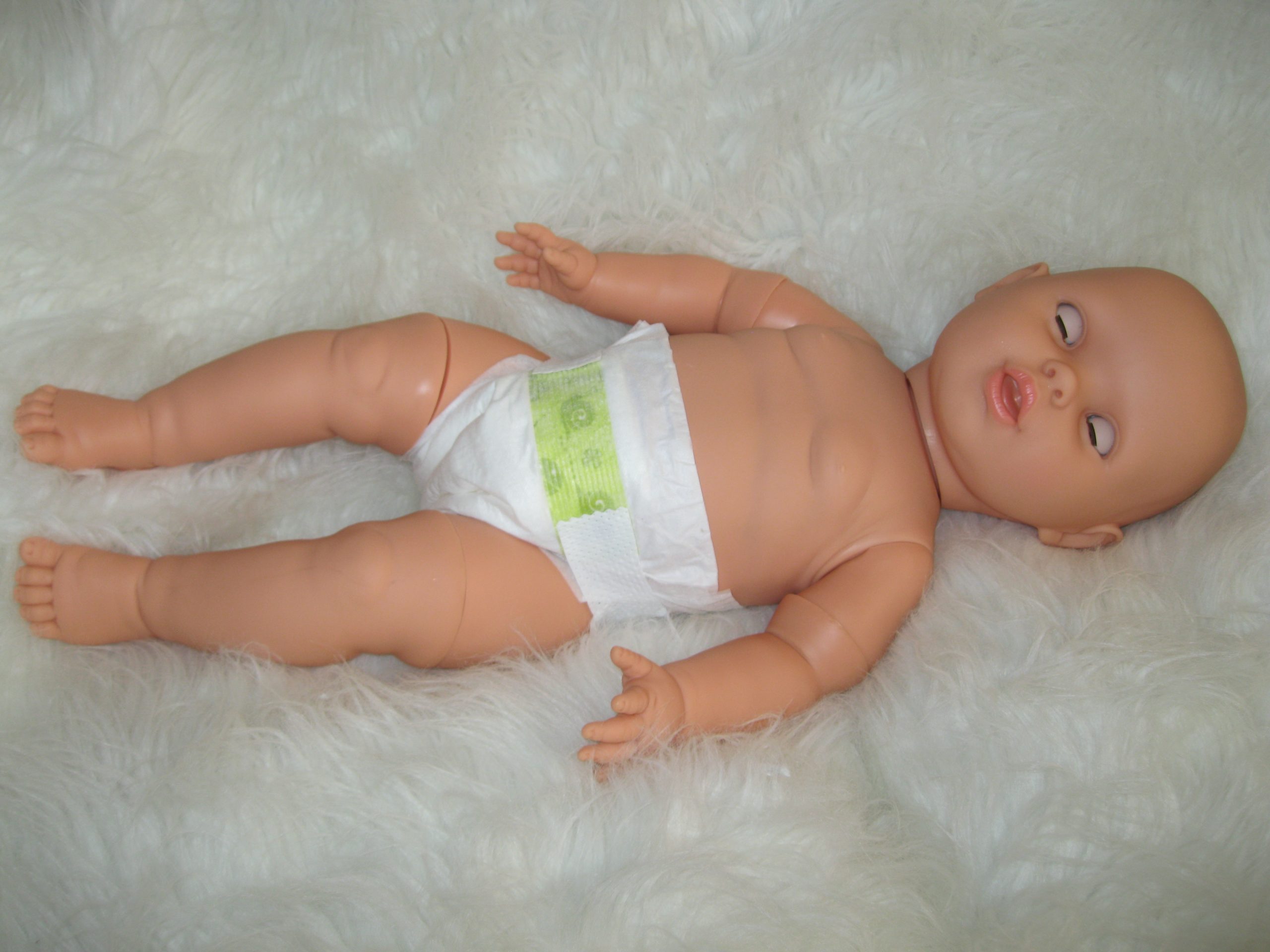 De pop heeft blauwe ogen die open en dichtgaan. Past gewone babykleding maat 62 soms maat 68 afhankelijk van het merk.